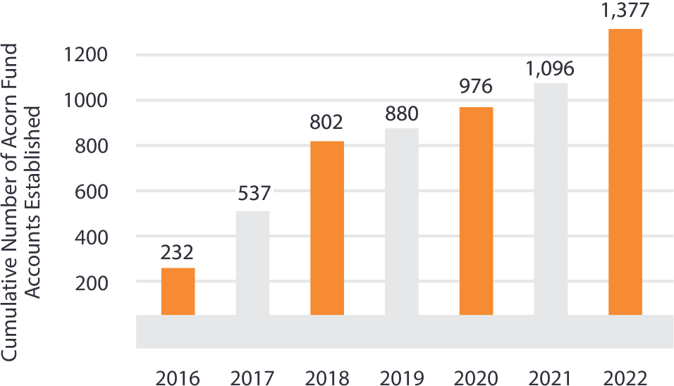 We’ve grown exponentially since 2016, and we’ve proudly watched our impact expand to benefit even more Acorn Scholars – those students using the money invested in their Acorn Fund account to pay for higher education expenses.